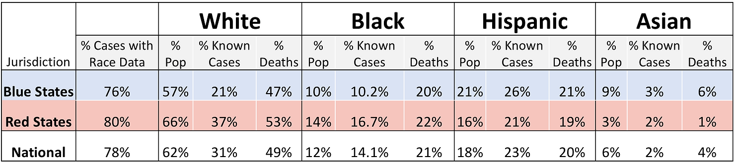 But the true test really is, how deadly is the disease? Table 3 makes it clear that blue states’ hard lockdown policies have been worse across the board for all races. The average case fatality rate is 3x worse for every single race in blue states than for red states. This once again gives the lie to the idea that extremely-restrictive lockdown policies provide protection to anyone.