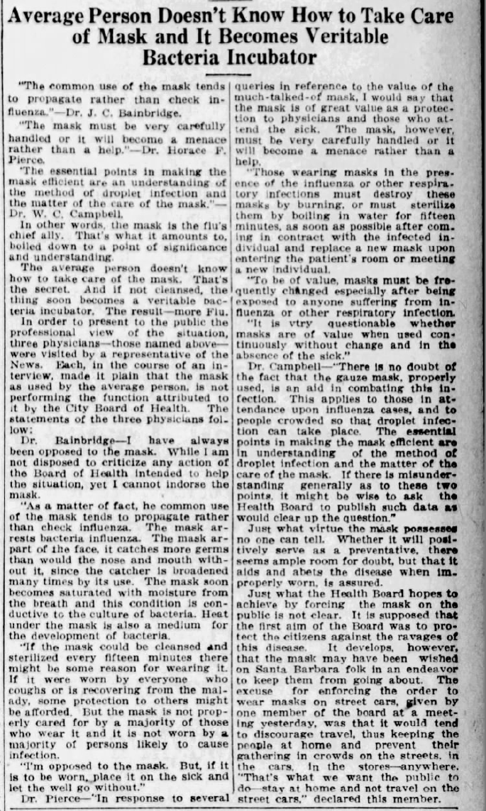 That headline was in the Santa Barbara Daily News and the Independent, Nov 16, 1918. "The average person doesn't know how to take care of a mask... and it not cleansed the thing soon becomes a veritable bacteria incubator." - Looking around you... has anything changed? Here’s the full article: