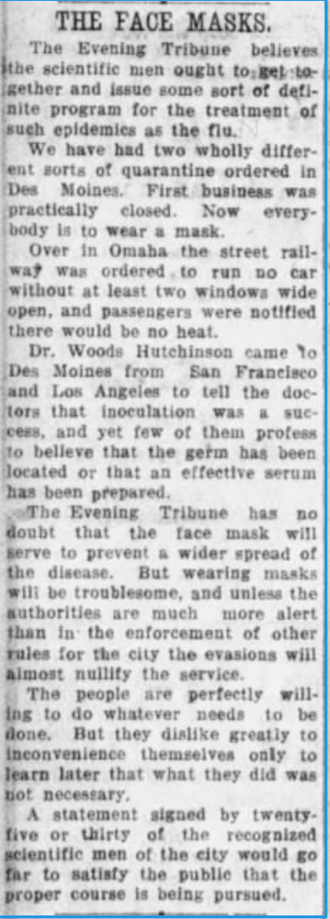 Let's hop over to Iowa. Des Moines Tribune, Nov 30, 1918.