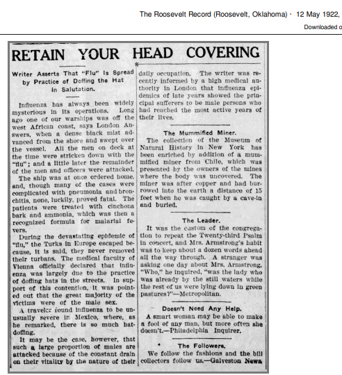 Of course, not all of the "science" back there was quite so impressive. A widely circulated report in the 1920's claimed influenza was passed from the "doffing" of hats.