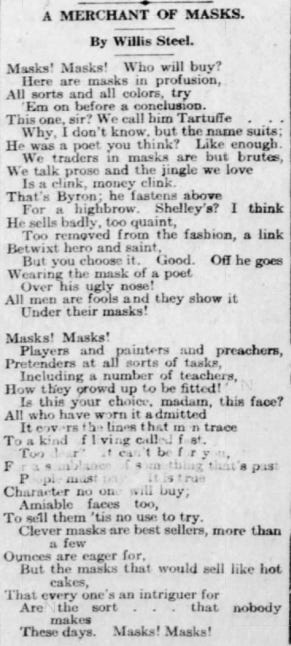 Here's one from The News Journal, Wilmington, Delaware, Feb 14, 1920 (still in publication today! @delawareonline ) a poem, satirical in style, decrying the plethora of masks in 1920 "Masks, masks, who will buy..."