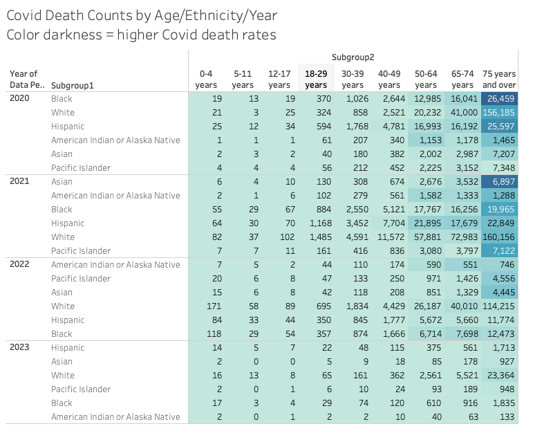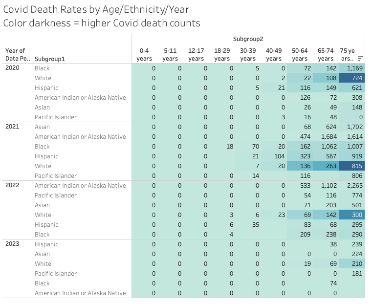 The first chart shows the rate (x/100,000 population) of covid deaths for the intersection of age and race and year. The color indicates the higher number of deaths.