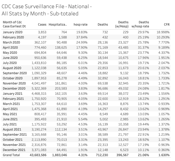For the entire audience we give you this chart which shows the basic stats by month for the entire pandemic. This file goes up to mid-December 2021 (with data still coming in).
