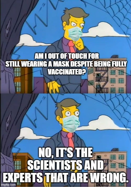 Posturing to be on the side of science, they ignore the science on the effectiveness of vaccinated and natural immunity and dangle variant fears. They wear masks after being fully vaccinated even though there has never been a documented cases of a fully vaccinated person who is asymptomatic transmitting the virus.