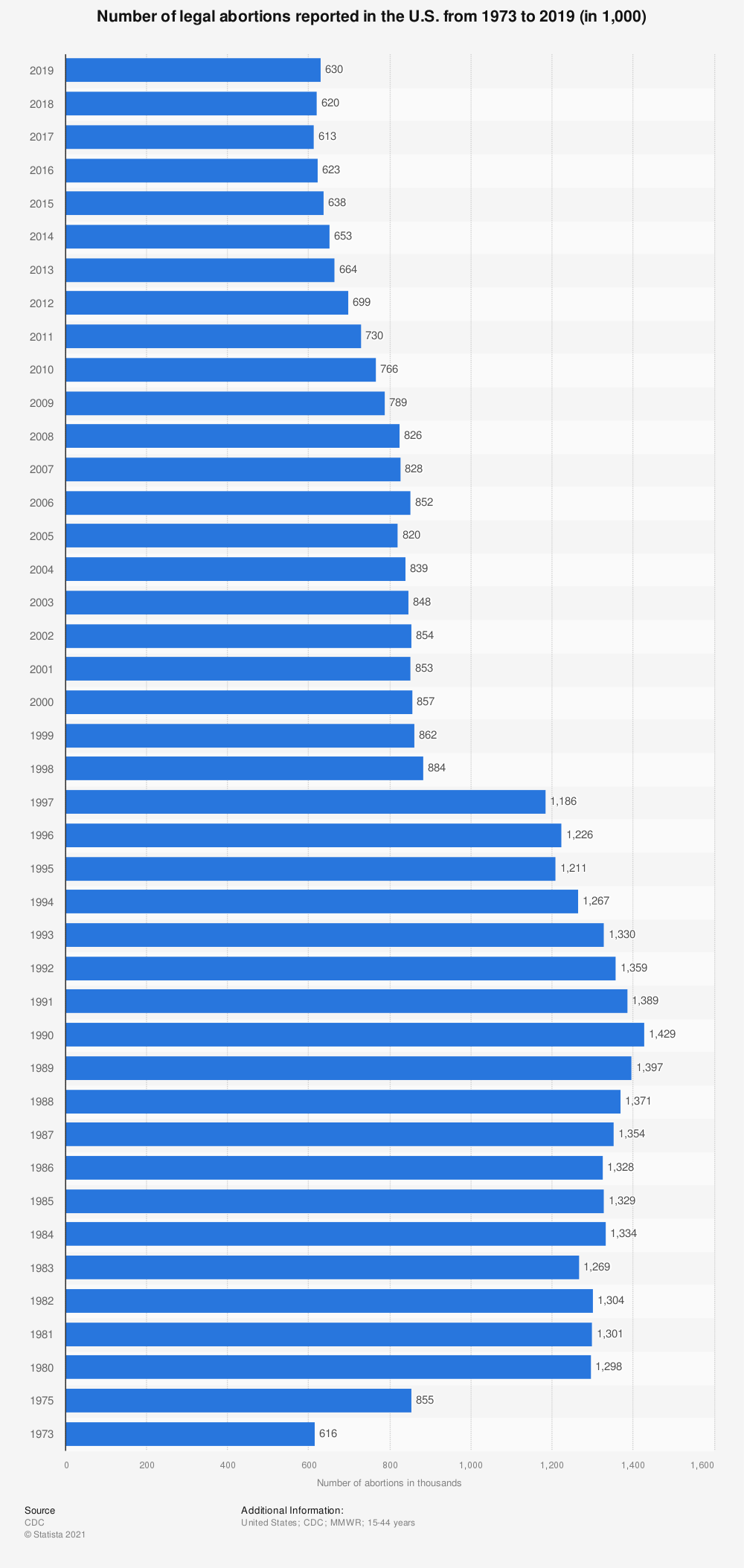 For 2019, a total of 629,898 abortions were reported to CDC. By comparison, there were 1.4 million abortions in 1990 (see chart at the bottom). The rate of abortions every year has dropped but the data here is muddy and the definitions have changed decade after decade.