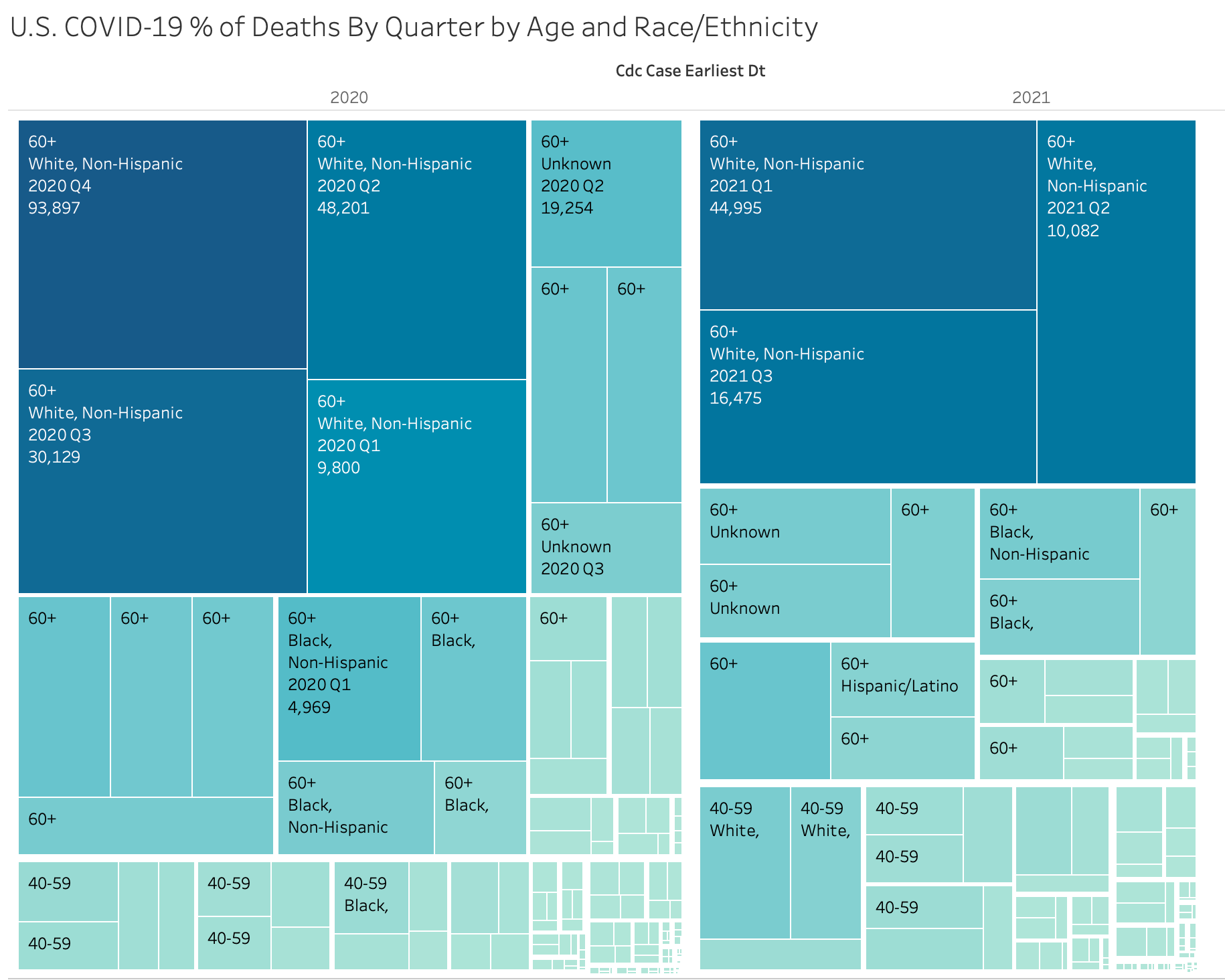First, a Treemap chart of all deaths by quarter. Each square represents the number of deaths for an age group & race/ethnicity by quarter.