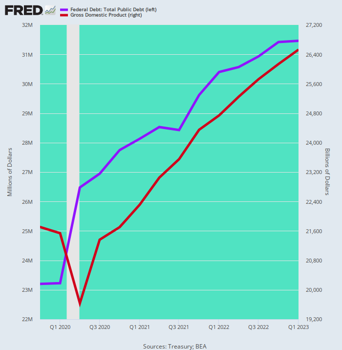 For avoidance of doubt, consider the chart below. It shows that between Q4 2019 and Q1 2023 the public debt (blue line) increased by $8.26 trillion—a figure equal to 1.70X the $4.82 trillion gain in nominal GDP (brown line).