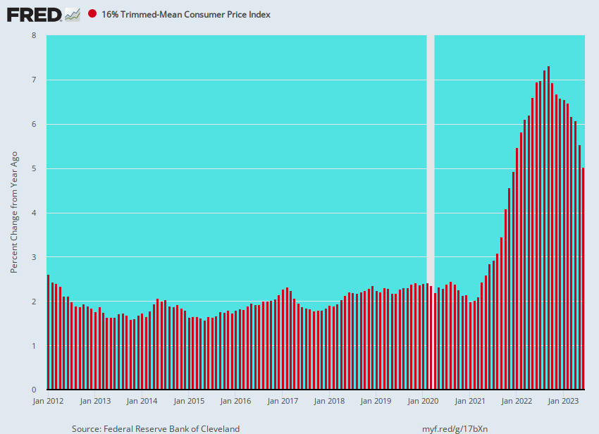 For want of doubt, here is the current run rate of the true inflation core as measured by the 16 percent trimmed mean CPI. Inflation is still running at 5 percent, meaning that the Fed will be in no position to resume its bond buying campaign anytime soon.