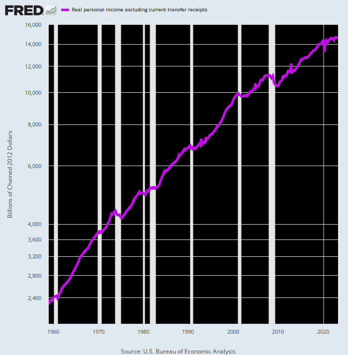 Here is a large caliber smoking gun. The BEA series for real personal income less transfer payments is a pretty serviceable proxy for private market output before the impact of Washington stimmies and distortions caused by transfer payments and government borrowing. After all, earned income – wages, salaries, bonuses, profits, interest and dividends – is the payment to factors of production for output and therefore its reciprocal.