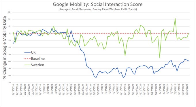 Google Mobility: Social Interaction Score (UK vs Sweden)