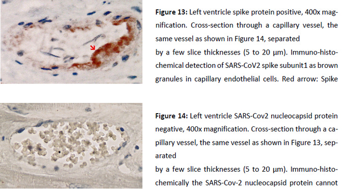 “In this study, detailed histopathologic analyses of the heart were undertaken in a 55-year old patient who died four months after mRNA vaccine booster. The cause of death as stated at autopsy was acute myocardial infarction and lymphocytic myocarditis associated with spike protein detected in the respective tissue. The results indicate that both myocarditis and thromboembolic events derived from a hyperinflammatory, excessive immune response to the mRNA-vaccine BNT162b2 (Pfizer-BioNTech) against COVID-19.”