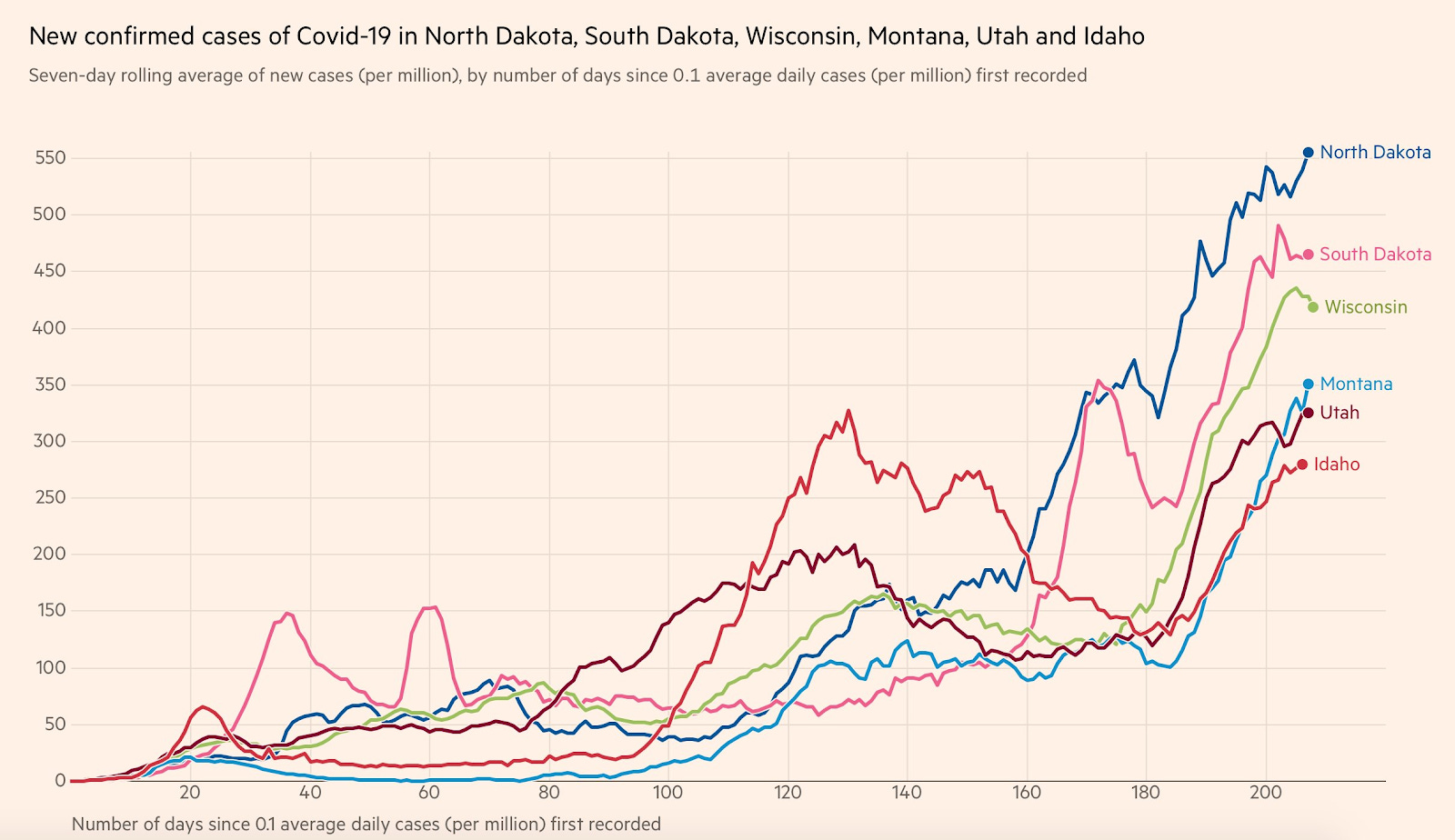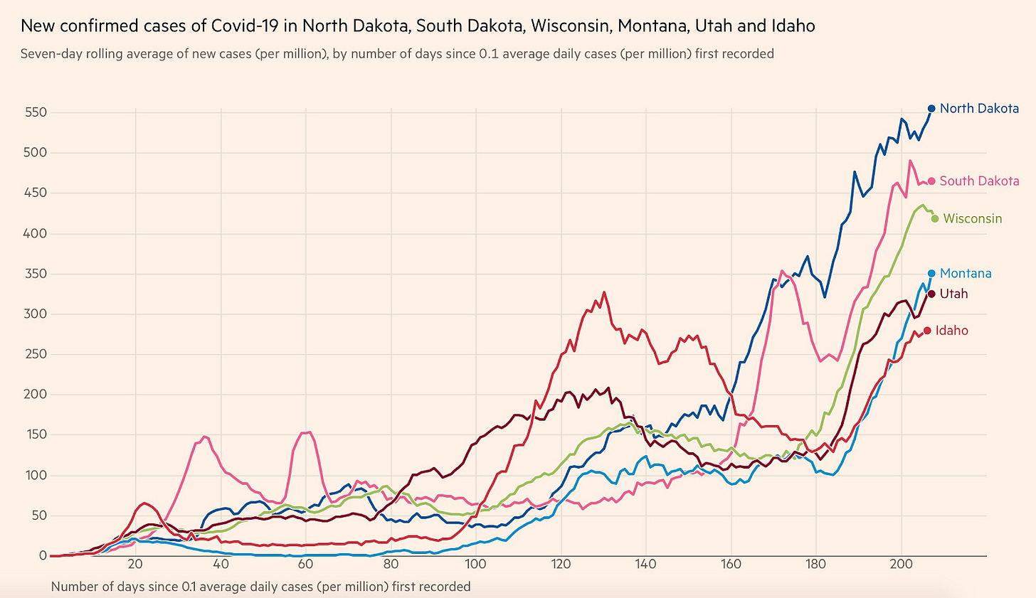 New Confirmed Cases of COVID-19 in North Dakota, South Dakota, Wisconsin, Montana, Utah, and Idaho