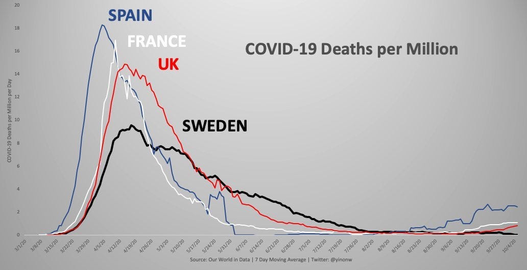After several months of hope that New Yorkers were starting to leave lockdowns, New York’s leaders decided medieval lockdowns by neighborhood made good sense, specifically targeting Orthodox Jewish communities. New Yorkers rebelled and resisted the new street-by-street lockdowns. New York is not alone in its lockdown fetish, Israel is under an even more extreme lockdown, while deaths keep rising. Meanwhile in Europe, political leaders are avoiding lockdowns at all costs while cases rise dramatically but severe cases remain under control and at a much lower incidence than in the first quarter of this year.