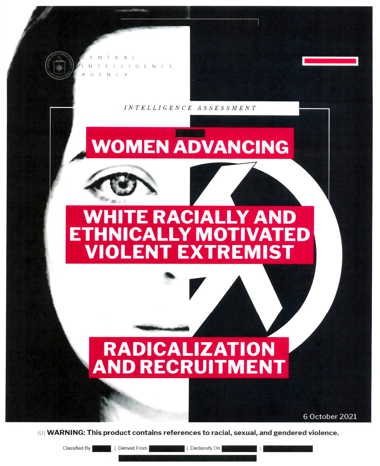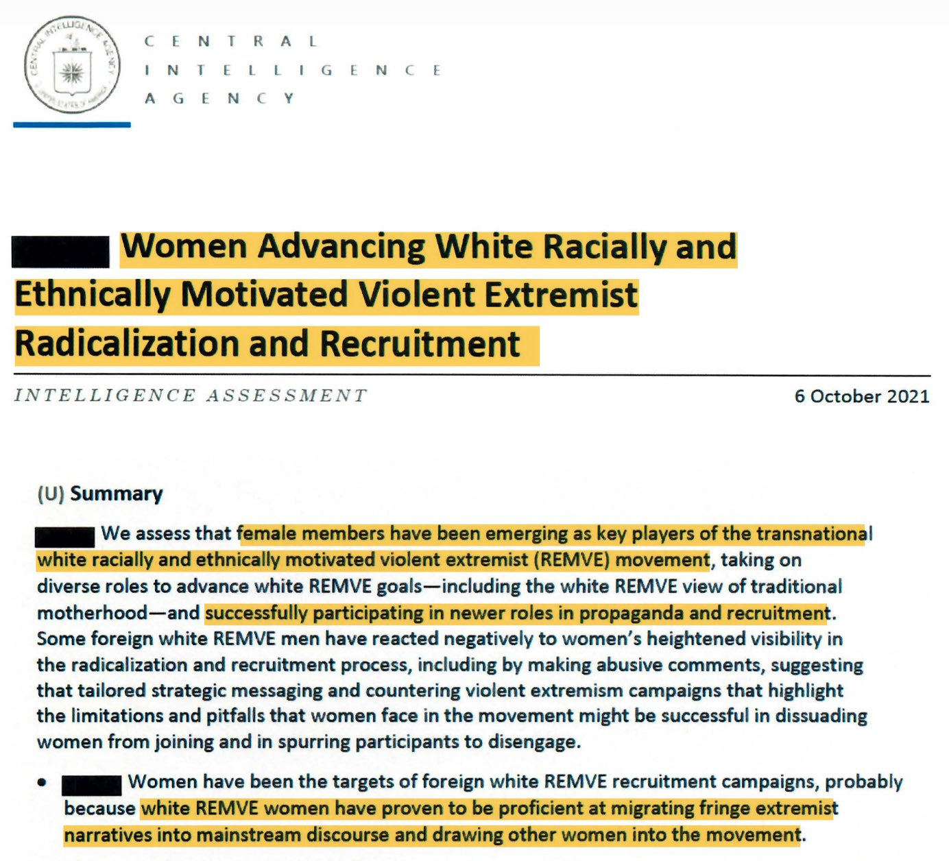 An intelligence assessment produced by the Central Intelligence Agency on October 6, 2021 identified “traditional motherhood” and “homemaking” as indicators of white racially and ethnically motivated violent extremism.
