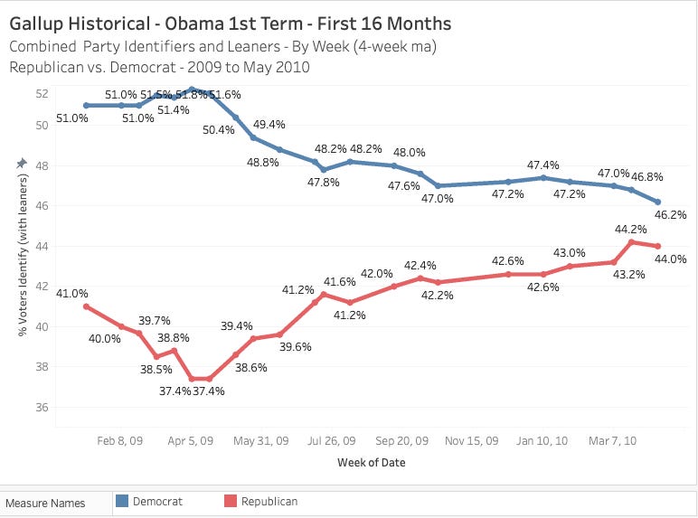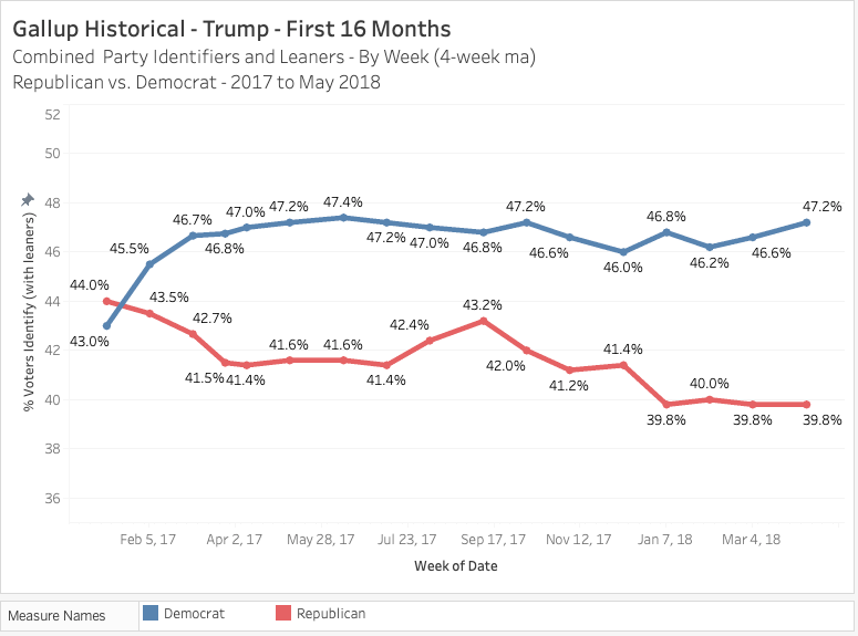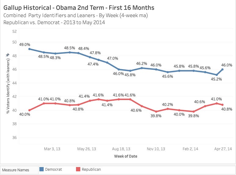 Gallup is closing in on nearly 90 years in the business taking the pulse of the American people on all sorts of topics. They conduct weekly phone calls with various segments of voters and citizens to assess their party preference. This particular poll has been around since 2004 so we have a good amount of data to go by.