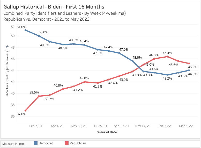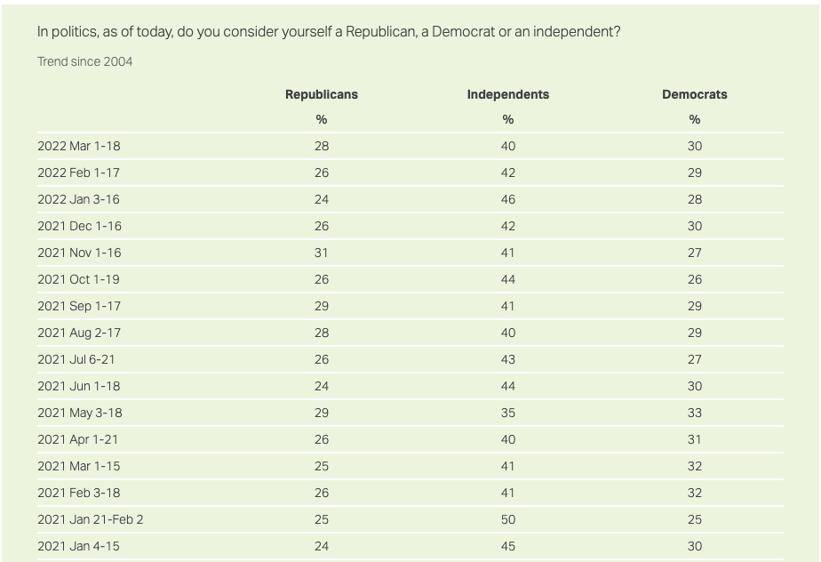This poll asks for party preference and also asks those who identify as independents which party they would choose if they HAD to at this moment in time. Democrats have always outnumbered Republicans by about 5 to 10 % points since FDR but the GOP has relied on the independent vote to get them over the hump. Here’s how the poll logged the 3 answers since Biden took office:
