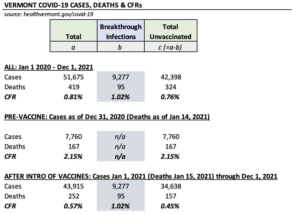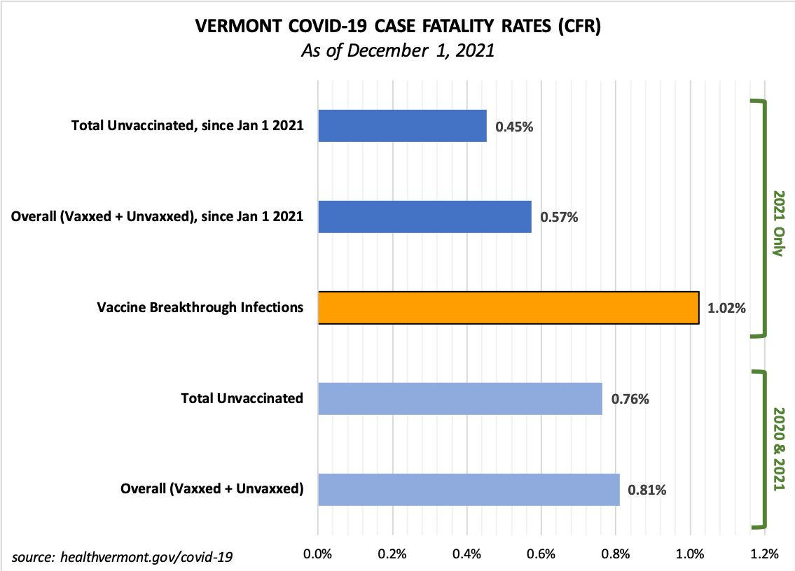 Vermont, the most highly vaxxed state (87% with ≥1 dose), reports 95 deaths among 9277 vaxx breakthrough infections for a BTI CFR of 1.02%. Compare this to an overall pandemic CFR of 0.81%, an Overall CFR for 2021 (the vaccine period) of 0.57% or an Unvaxxed 2021 CFR of 0.45%.