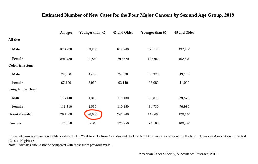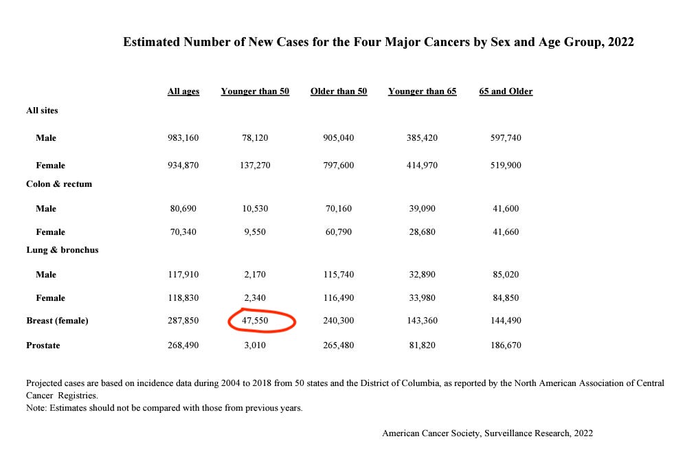 I saw a rather alarmist video on Twitter about the numbers of cancers reported in females under the age of 50. He claimed that in 2022 cancers for these younger women had risen from a pre-pandemic count of 26,600 to an alarming 47,550.