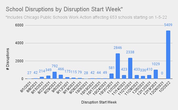 1. School closures by week reached their highest total of the academic year last week, as Covid 19 cases and staffing shortages drove the bulk of disruptions. Our New Year's Eve update found only 1,591 schools had announced closures or virtual instruction for the week of 1/3, but we ended last week having identified 5,409 due to announcements that continued through the week.