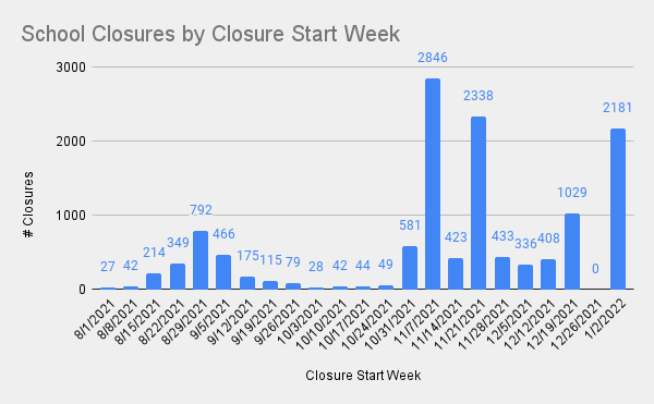 1. Below is our school closure by week map. In the last week we saw an increase to 1,591 schools (updated to 2181 over the weeked) that will close for in-person learning for at least one day the week of January 3rd. Closures tend to fall into two categories: a) The majority of district closures are one or two week virtual learning breaks due to rising Covid 19 cases b) A handful of big districts are spending the first one to three days of the New Year distributing testing kids to staff and families. The average closure length for schools closing the week of January 3rd is 6 days.
