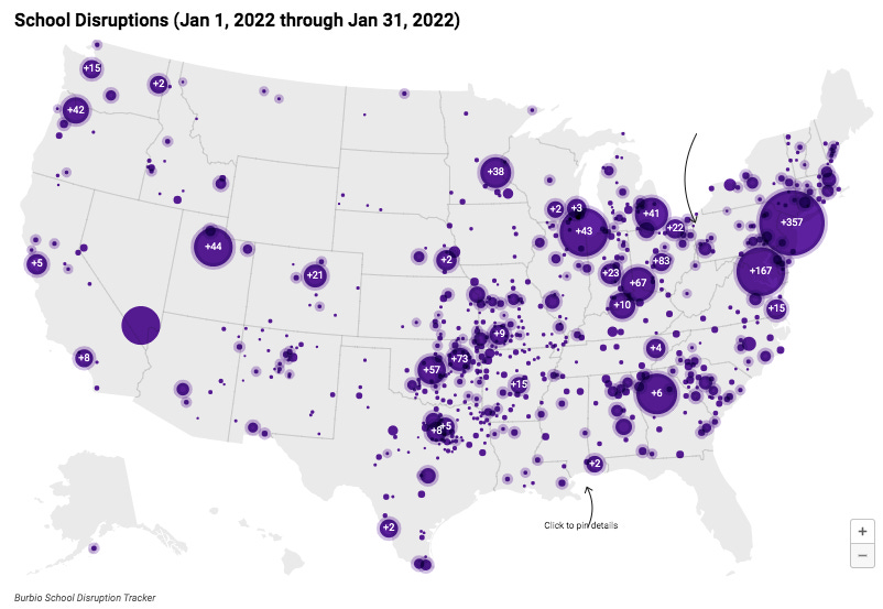 Last week we saw a gradual slowdown in disruptions across the US as schools that closed or went virtual over MLK Weekend reopened for in-person learning. We did not see an end-of-week spike similar to what we saw the previous week, even as disruptions remain at levels higher than the Fall. More below.