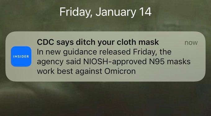 Of course, the stupid thing is that this has NOTHING to do with omicron and EVERYTHING to do with the fact that masks (cloth and others) do nothing. Pretending that it has something to do with omicron is just more government lying and it is really, really irritating. Abandon your unconscionable hubris and get up and tell the truth...just once. And telling the truth covered by a lie (like this) does not count.