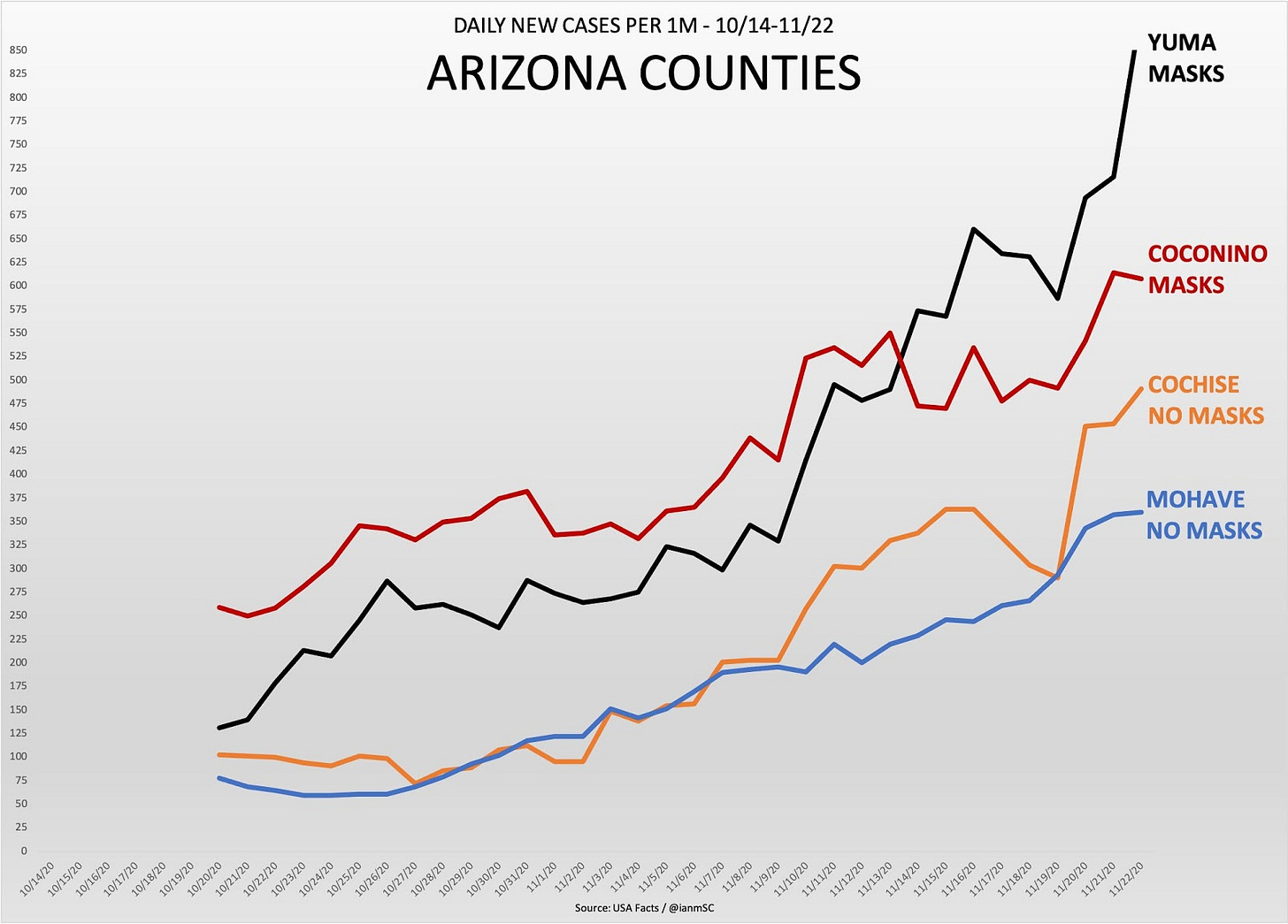 Here are four Arizona counties that are all similar in population, and low density. Two have mask mandates, one never has, and one had all major cities rescind masks ending on 10/21/20. Since that time, Yuma has had the worst case growth despite masks & Coconino has remained high.