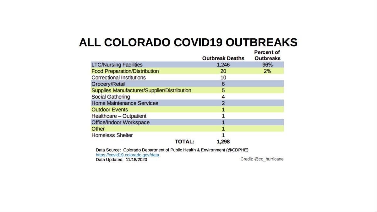 In Colorado, the data shows it’s highly concentrated, confined (ie "locked down") communities that are main sources of COVID19 outbreaks. Deaths on the other hand were with the very old/elderly and those with severe comorbidities.