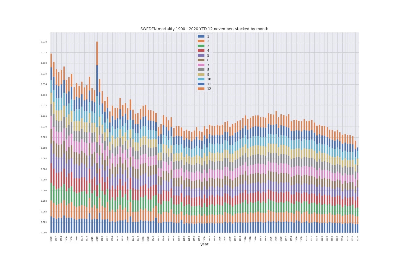 Sweden Mortality 1900-2020 YTD November, Stacked by Month