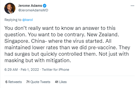 Here’s former Surgeon General Jerome Adams toeing the line.