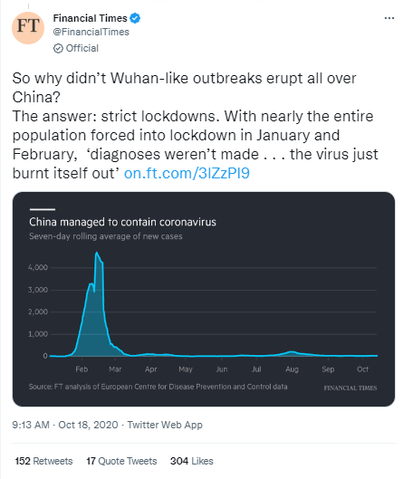 Here’s the Financial Times attributing China’s “success” to Xi’s “strict lockdowns.”