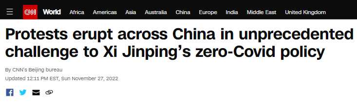Mainstream headlines are alight with stories about protests of unprecedented proportion that have erupted across China in response to Xi Jinping’s draconian Zero Covid lockdown policies. I post these with the caveat that, owing to both the unique restrictions on information from China and our media’s false pretense of hawkishness in order to retain the public’s trust, stories about protests and instability in China are perennially exaggerated.