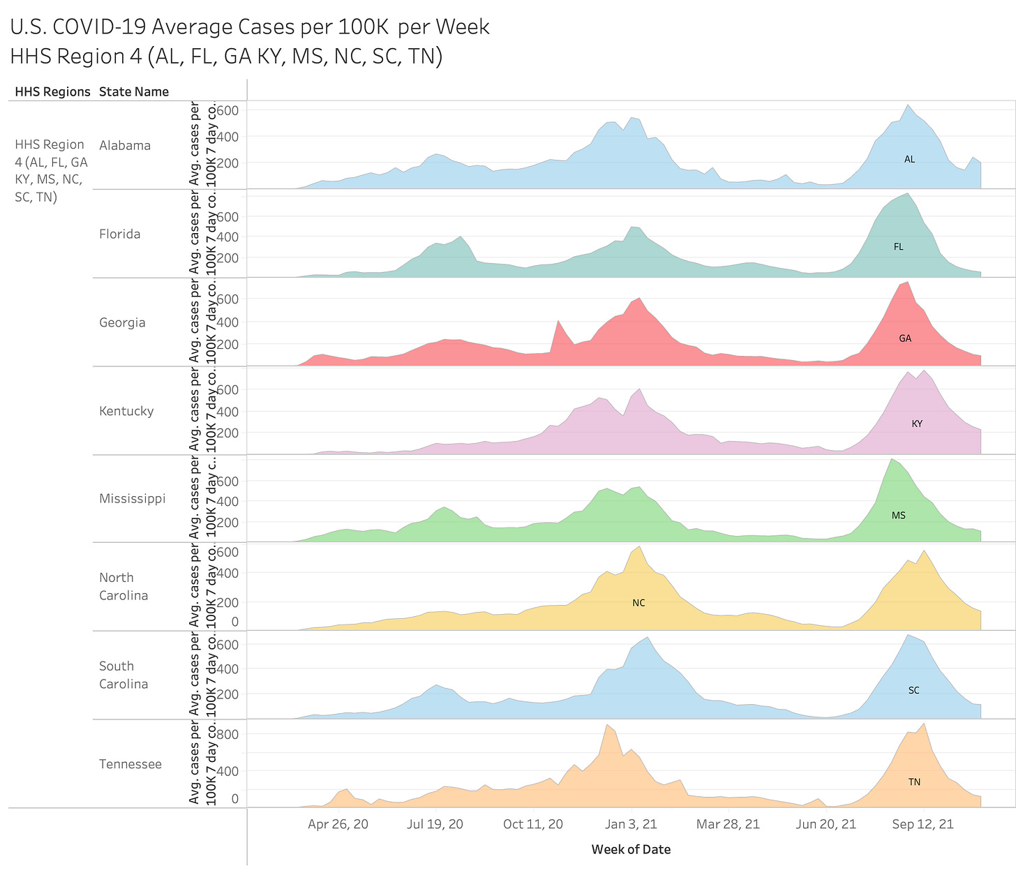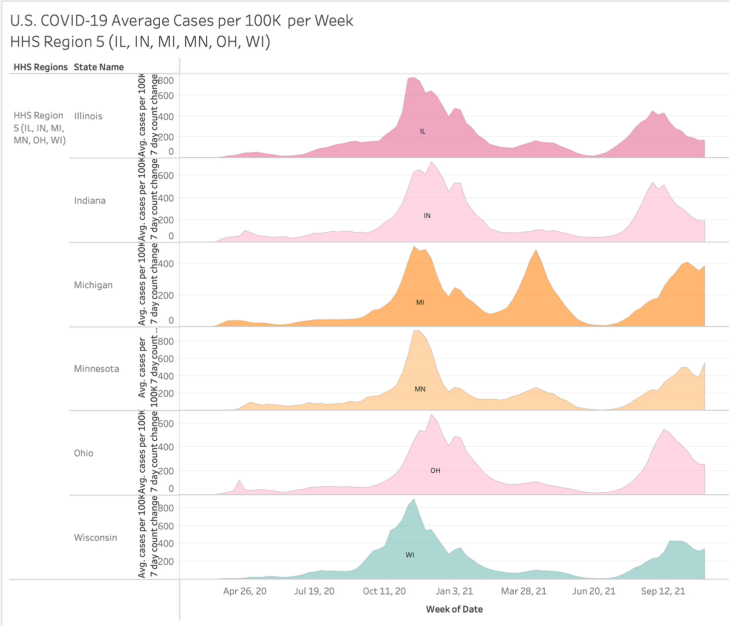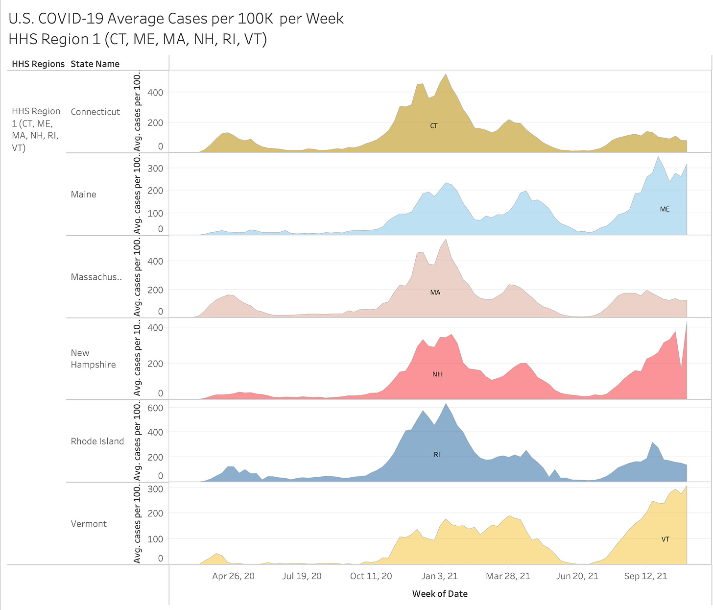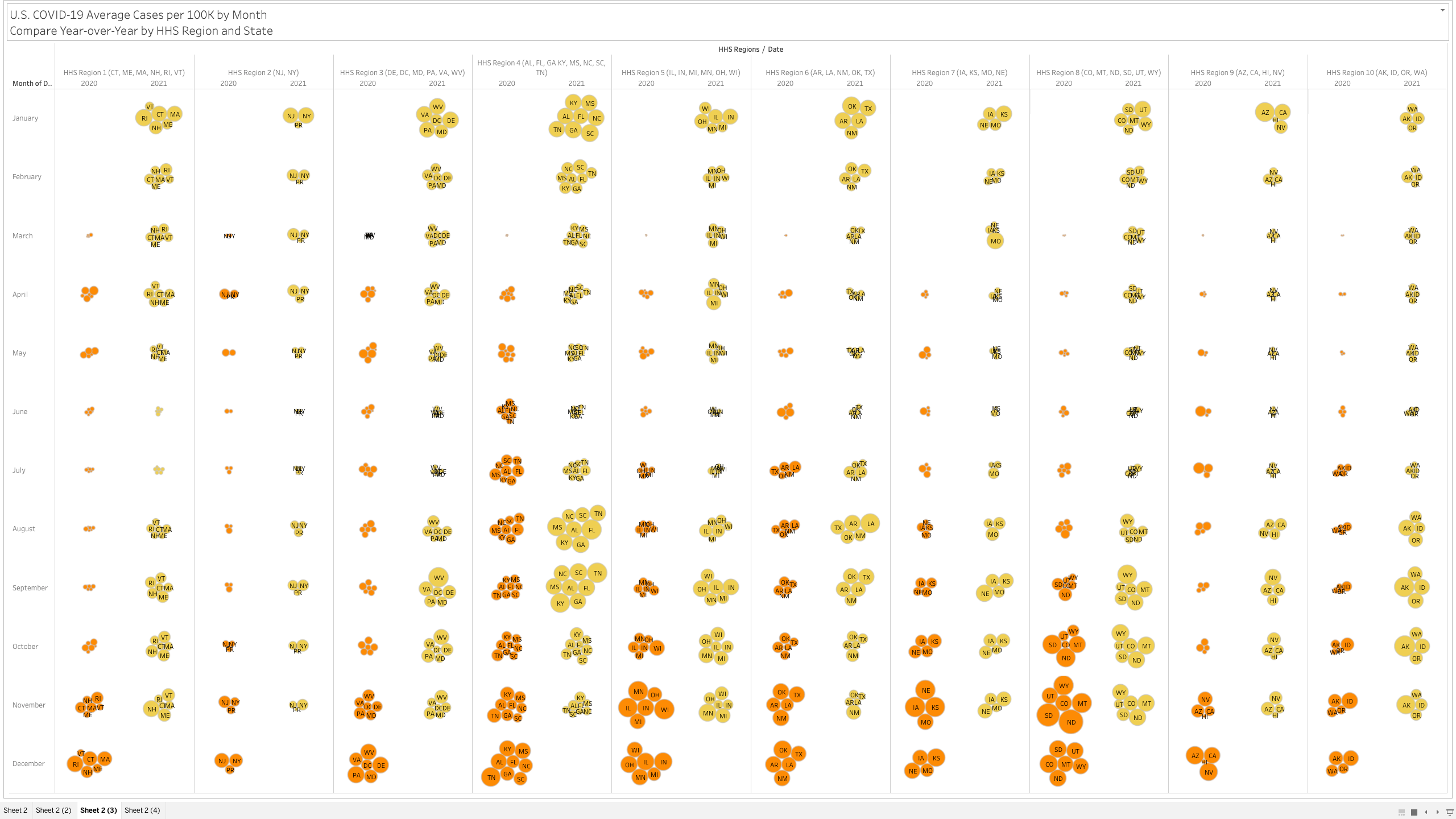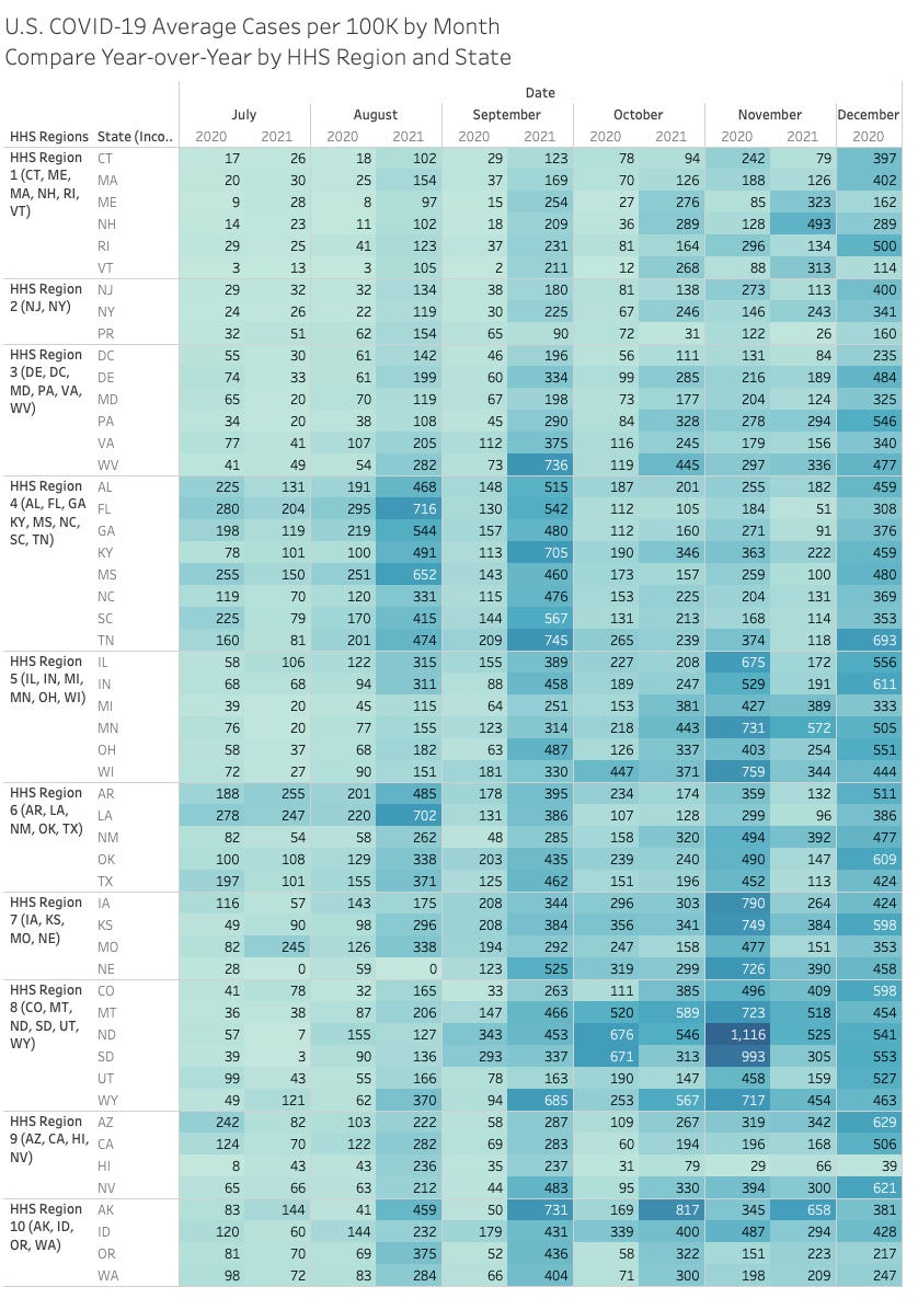 Here’s an interesting view… you have to go full screen big screen to see it all but it showing 2020 vs 2021 by month and HHS region. The size of the state bubble denotes the size of the average cases per 100K for that month.