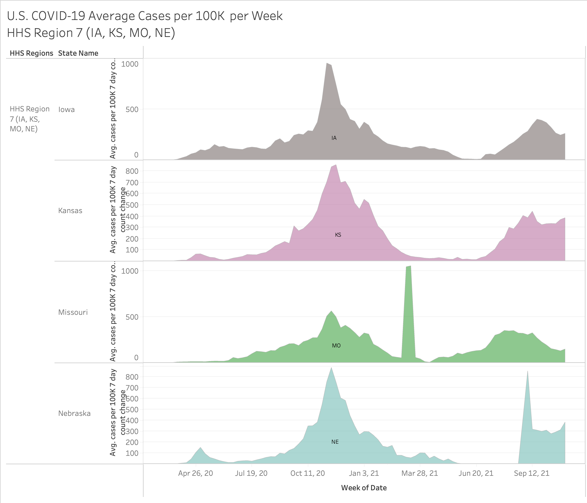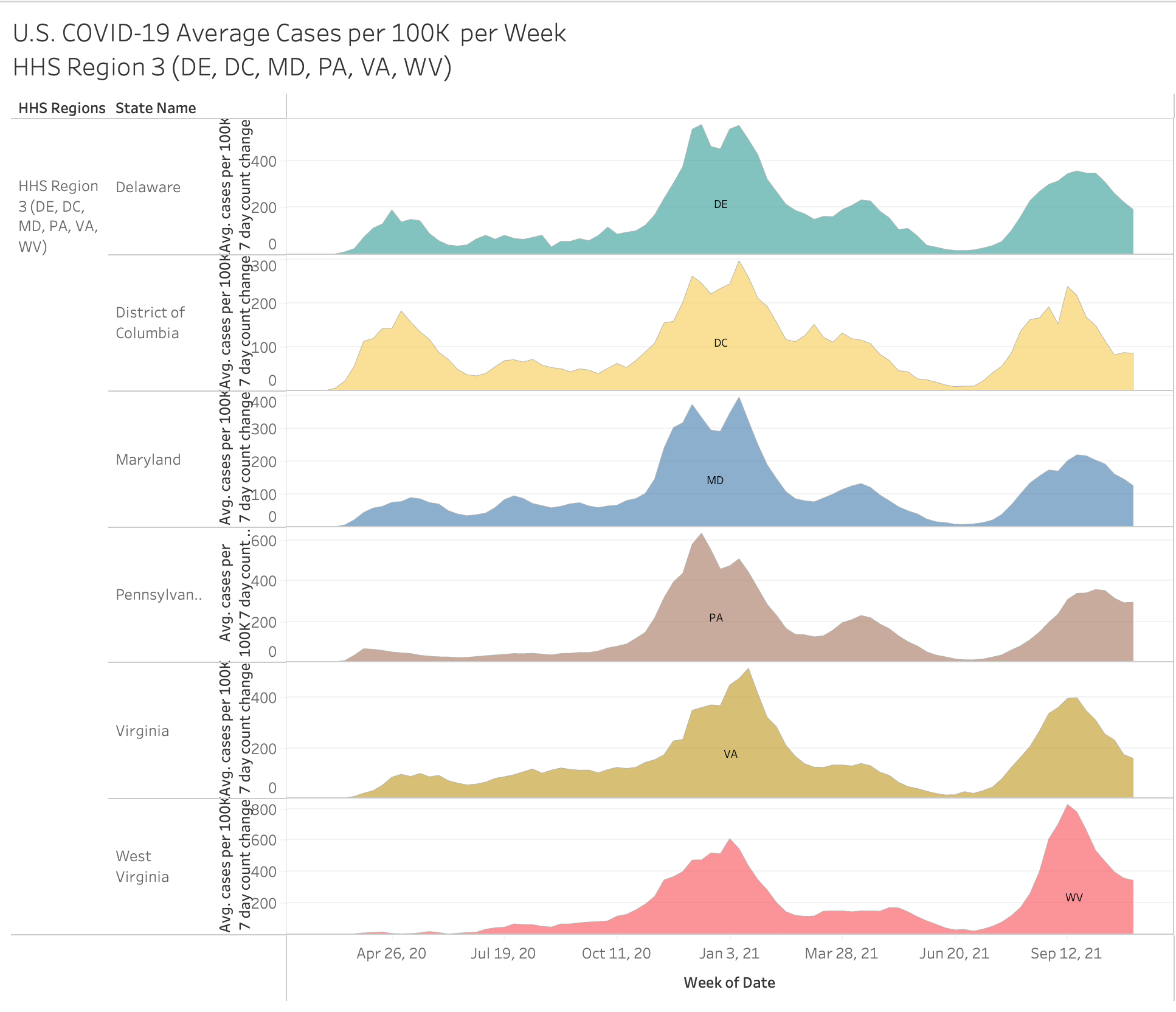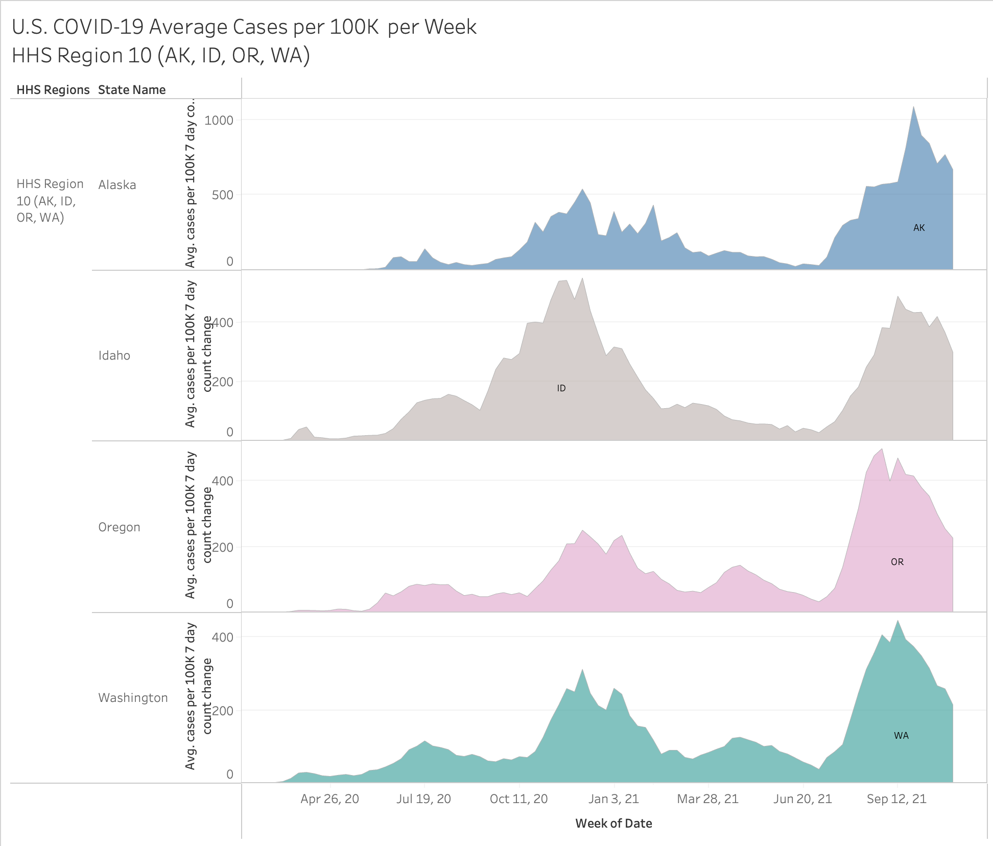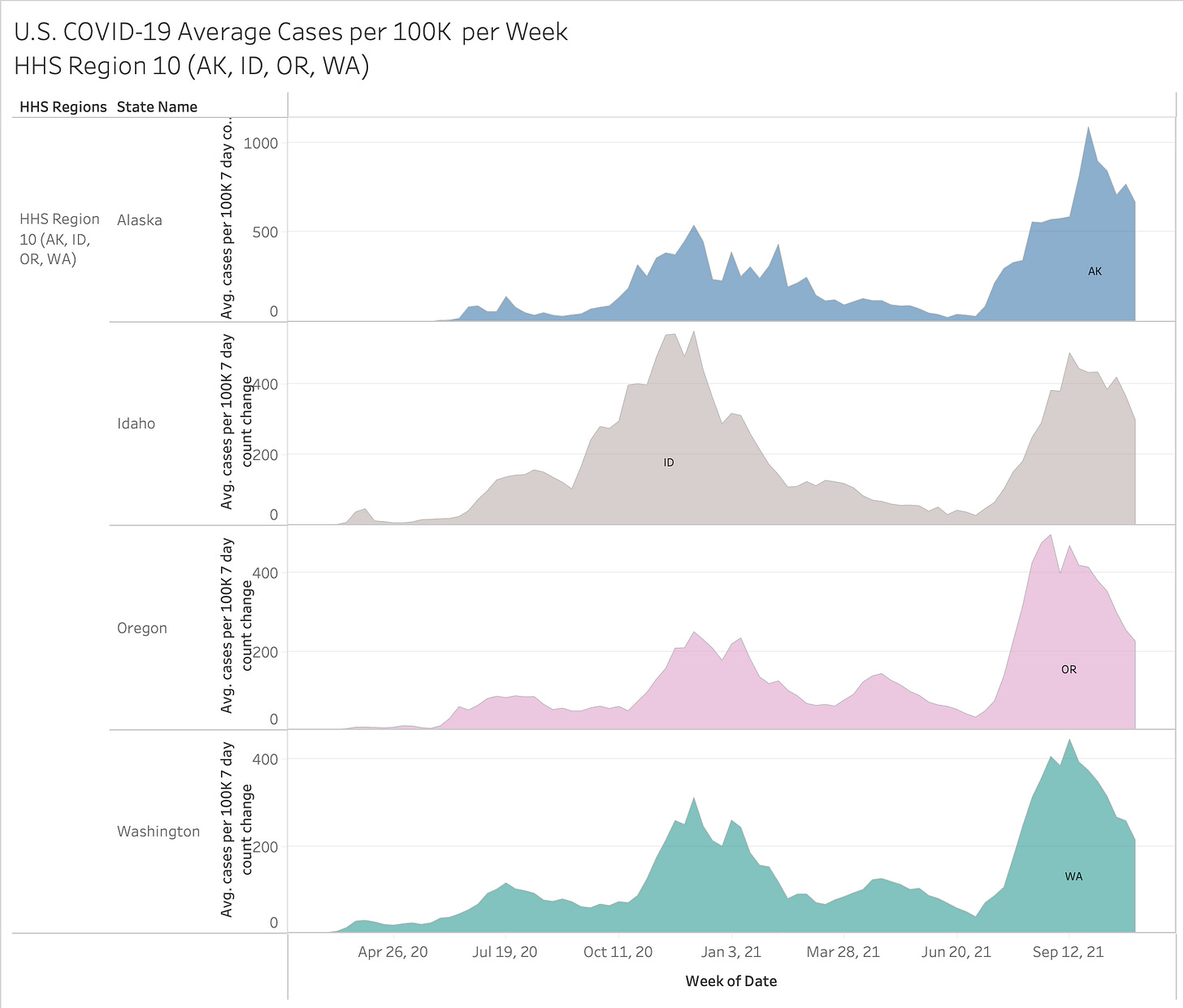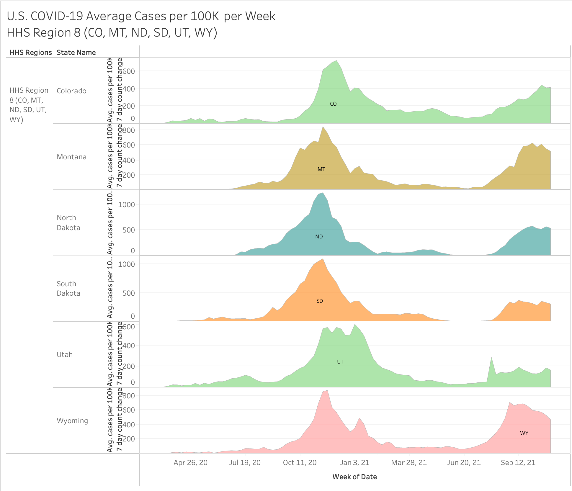 Here’s an interesting view… you have to go full screen big screen to see it all but it showing 2020 vs 2021 by month and HHS region. The size of the state bubble denotes the size of the average cases per 100K for that month.
