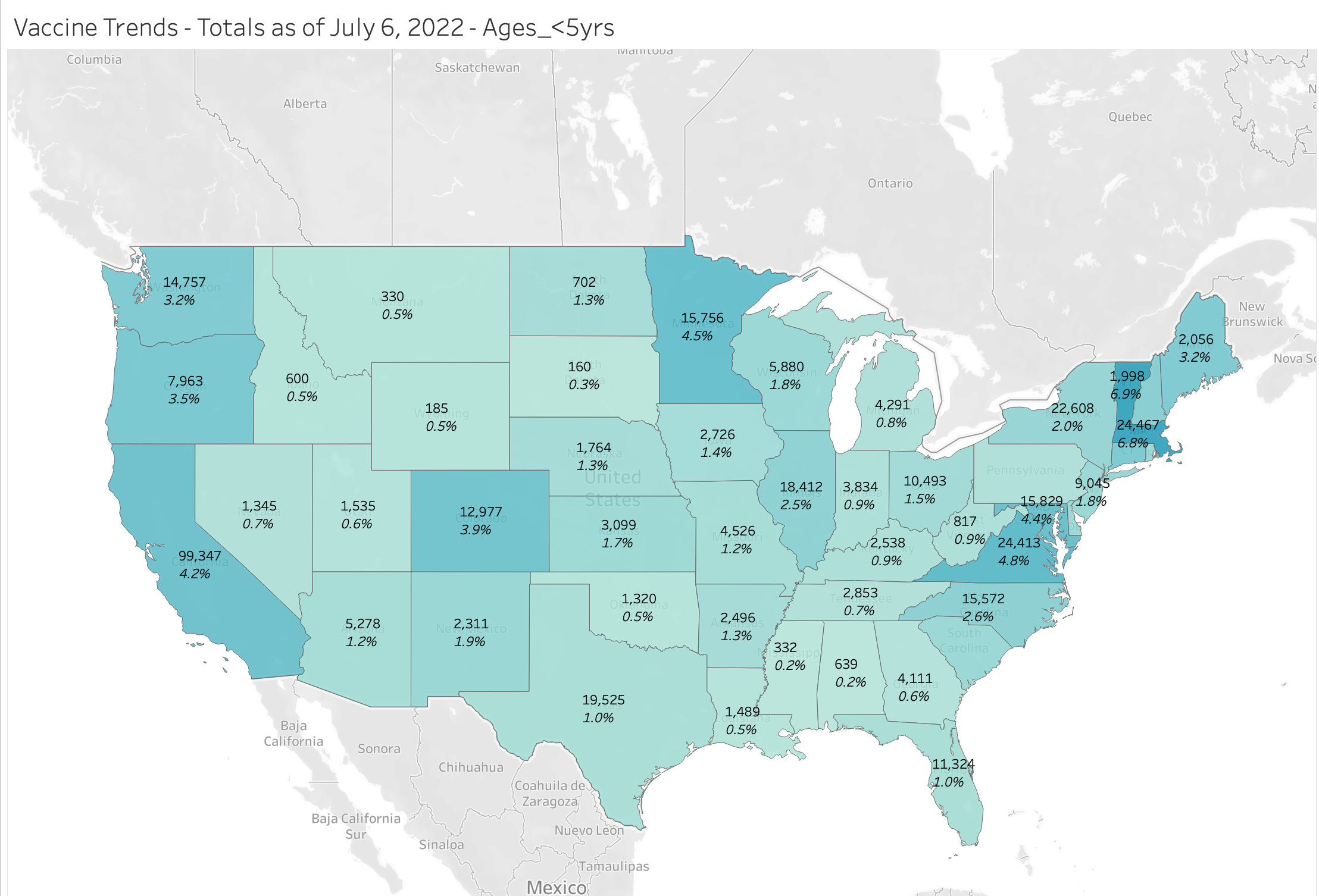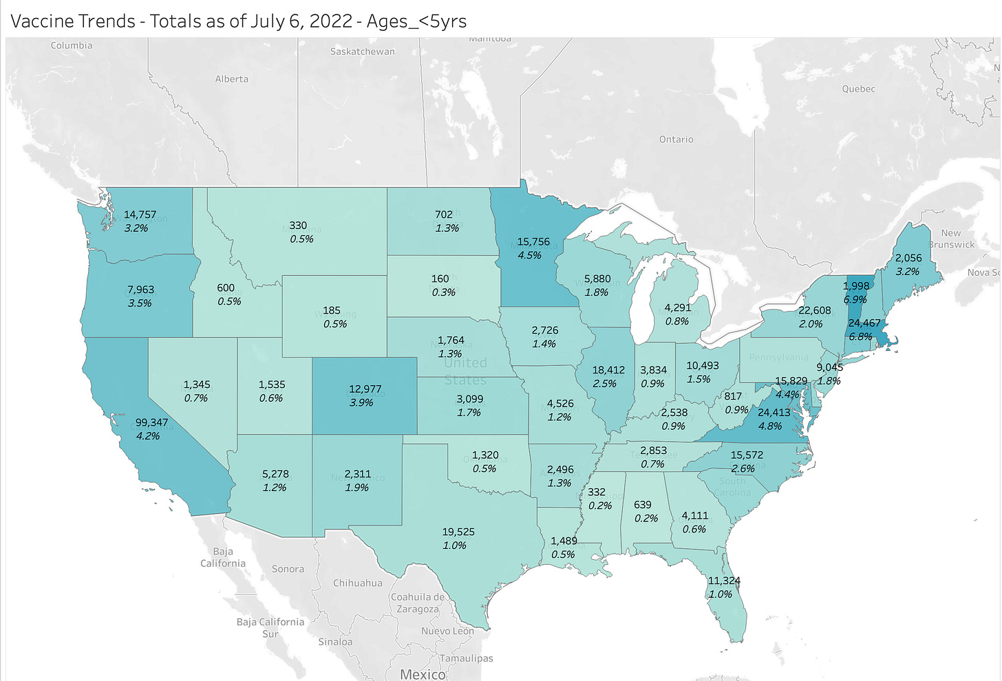 Even more positive is that the <5 vaccine has been out for 3 weeks and is holding at 2%., In some states the percentage of infants receiving 1 does is below 0.5%. All in all, just over 400,000 children (out of 20 million nation-wide) have received 1 dose of the vaccine in EUA status.