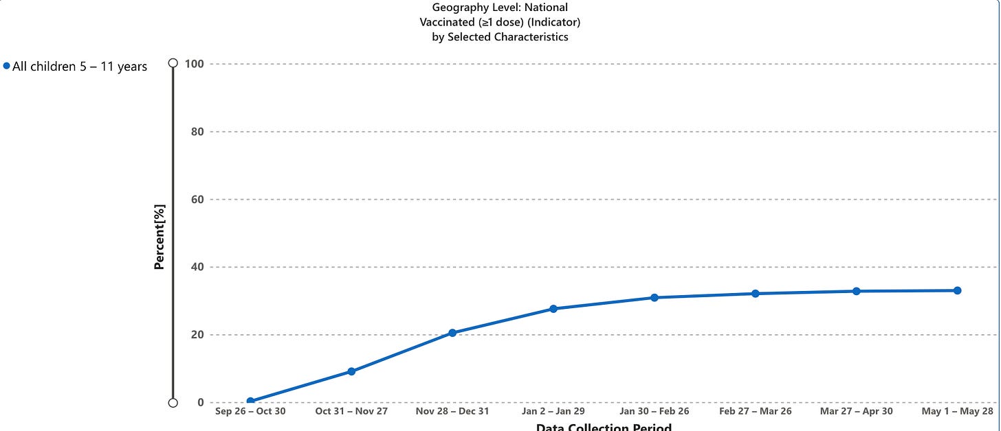 The release of vaccine approval for 5 to 11 year olds in the late fall 2021 rose to 20% with at least 1 dose by the new year but has since stalled and has not surpassed 35%