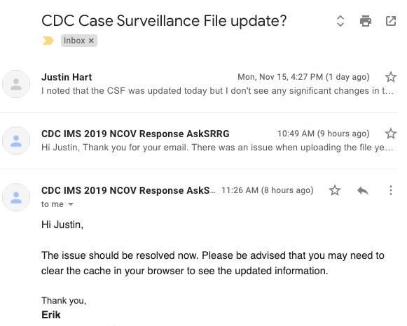 We’re gonna walk through the latest update to the file which came out today. Actually, it came out yesterday but I emailed the CDC that the file DID NOT update as well. Surprisingly, “Erik” was manning the inbox and updated the file per my request!