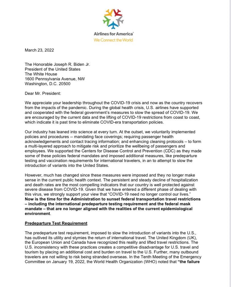 “10 CEOs of US passenger and Cargo airlines send letter to President Biden calling for an end to the onboard mask mandate and pre-depature testing rules”