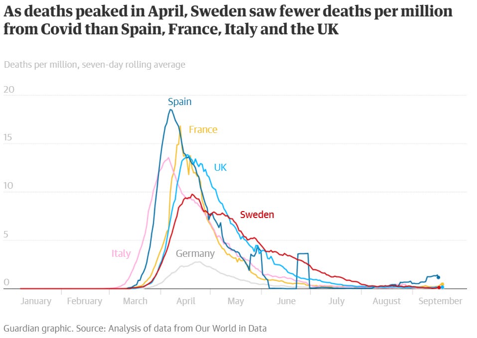 As deaths peaked in April, Sweden saw fewer deaths per million from Covid than Spain, France, Italy and the UK