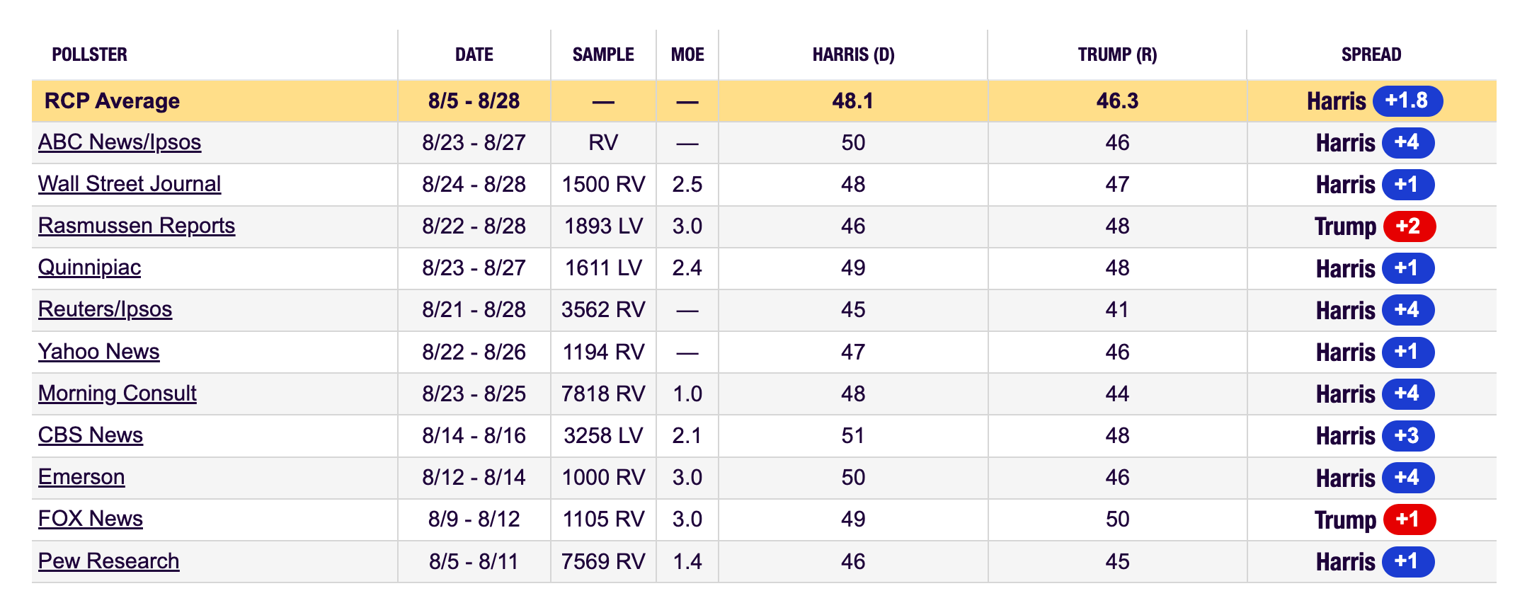 Harris’s lead in the national polls is slim—just 1.8 points, according to RealClearPolitics.