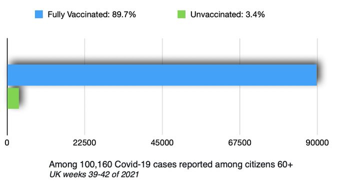 #7 A similar situation was described for the UK. Between weeks 39-42...100,160 COVID-19 cases were reported among citizens of 60 years or older. 89,821 occurred among the fully vaccinated (89.7%), 3,395 among the unvaccinated (3.4%).