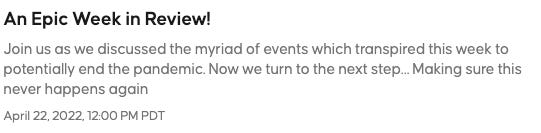 Join us at noon eastern, 3:00 pacific to discuss all the events of the week!
