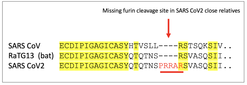 The closest known sibling of SARS-CoV-2, a bat coronavirus named RaTG13, at best weakly infects human cells and lacks an FCS. SARS-CoV is another sibling of SARS-CoV-2, and like all the other known siblings, also lacks an FCS. Without an FCS, SARS-CoV-1 spread around the world in 2003-2004 but fizzled out after infecting about 8,000 people. A comparison of the short stretch of amino acids in the spike protein clearly reveals the missing FCS in these SARS-CoV-2 siblings (Fig. 2).