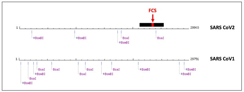 Two BsaI cut sites can be found in the SARS-CoV-2 genome (Fig. 3) in the same location as BsaI cut sites engineered into WIV1 back in 2017. The astronomical odds of this being coincidence cannot be overstated. According to the authors, “BsaI or BsmBI sites were introduced into the [spike]. Then any spike could be substituted into the genome of [lab engineered WIV1] through this strategy.” The same strategy might have been used in the construction of what would become the SARS-CoV-2 genome.