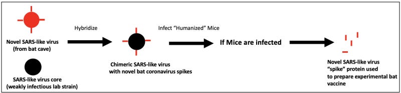 What follows is a streamlined version of the workflow proposed by the researchers: 1) add the spike proteins from these novel bat coronaviruses to a previously characterized SARS-like bat coronavirus core, and insert genetic modifications to spike proteins for enhanced infectivity if necessary, 2) infect “humanized” mice with these lab-made viruses, 3) flag chimeric viruses capable of infecting the mice as potential pandemic strains, and 4) prepare “spike” protein vaccines from these potential pandemic strains and use them to “immunize” bats in caves (Fig. 1).