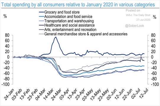 "The unemployment rate in the leisure and hospitality industries, including restaurants, soared from 5.7% in February to 39.3% in April, and in June was still at an unprecedented 28.9%. By comparison, the overall unemployment rate is 11.1%..."