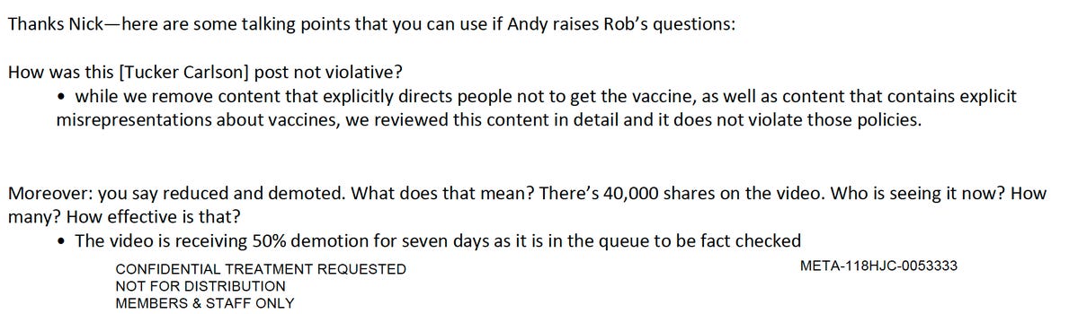 To appease the Biden White House, talking points were drafted for Clegg. Facebook was ready to tell the White House that it had demoted a video posted by Tucker Carlson by 50% in response to the White House’s demands, even though the post didn’t violate any policies.