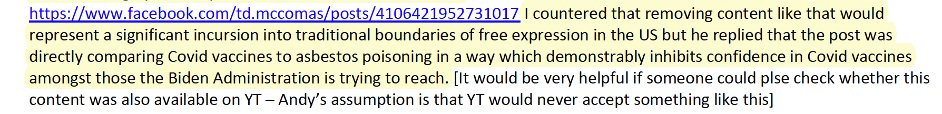 Only after the Committee announced its intention to hold Mark Zuckerberg in contempt did Facebook produce ANY internal documents to the Committee, including these documents, which PROVE that government pressure was directly responsible for censorship on Facebook.