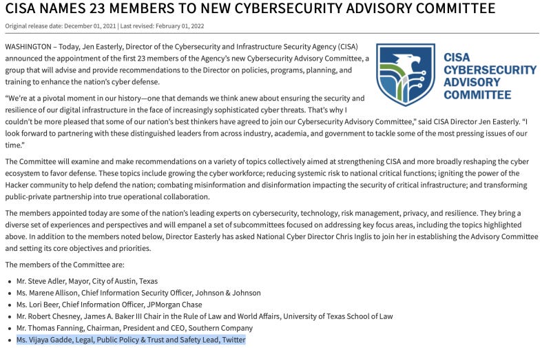 Her termination from Twitter did not leave her unemployed and homeless. A year earlier, she had already been tapped as an advisor to CISA, which is the government’s Cybersecurity and Infrastructure Security Agency headed by Jen Easterly, who was chosen to head the new agency (created in 2018) out of her tenure at the National Security Agency. As Freddy Gray puts it in the UK Spectator, “That seems fishy, to put it mildly.”