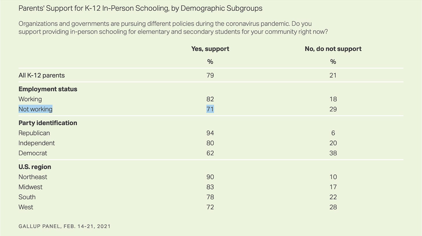 Furthermore, a recent Gallup poll shows 79% of K-12 parents want a full return to in-person school. This overwhelming support cuts across political affiliations in every region of the country.